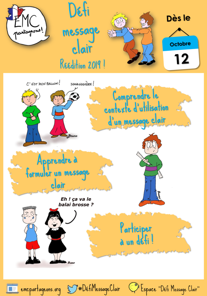 Pour préparer le [EMC Défi message clair](mention:96d0282b-b96d-4814-8cb9-c62801ca30e3 "/index.php?r=space%2Fspace&cguid=96d0282b-b96d-4814-8cb9-c62801ca30e3"), l'équipe vous propose une première séance sur le contexte d'utilisation. Le langage oral au service de la résolution autonome de petits conflits entre pairs, c’est ici : [https://www.emcpartageons.org/2019/10/11/defi-message-clair-reedition-2019/](https://www.emcpartageons.org/2019/10/11/defi-message-clair-reedition-2019/)
